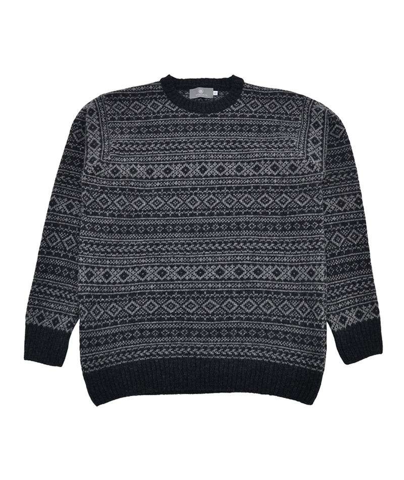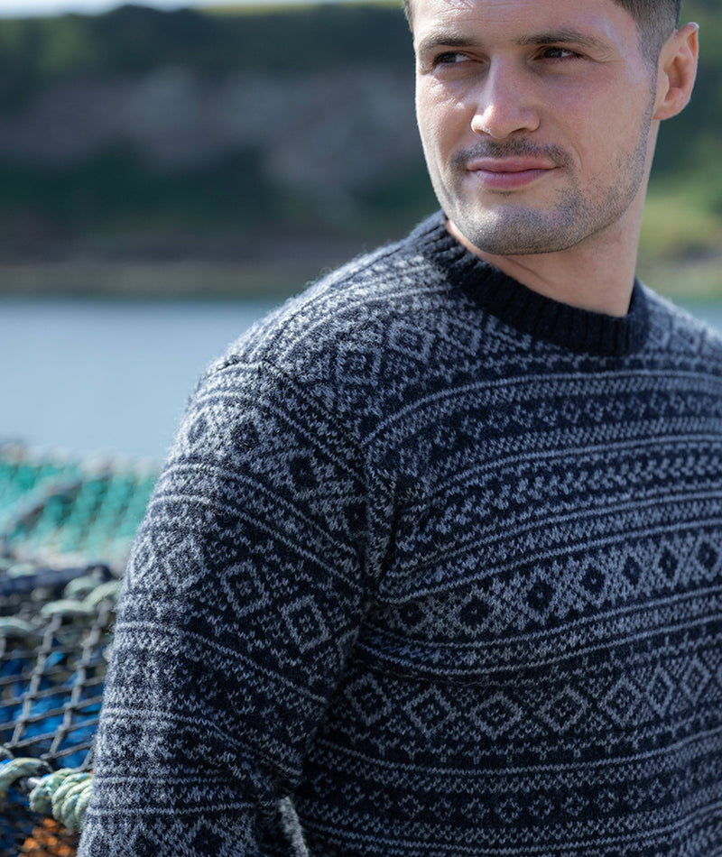 A Men's fair isle jumper in our "Conan" two-tone pattern with classic crew neckline, ribbed hem and cuffs. Knitted in Shetland-character wool for a crisp, authentic feel.