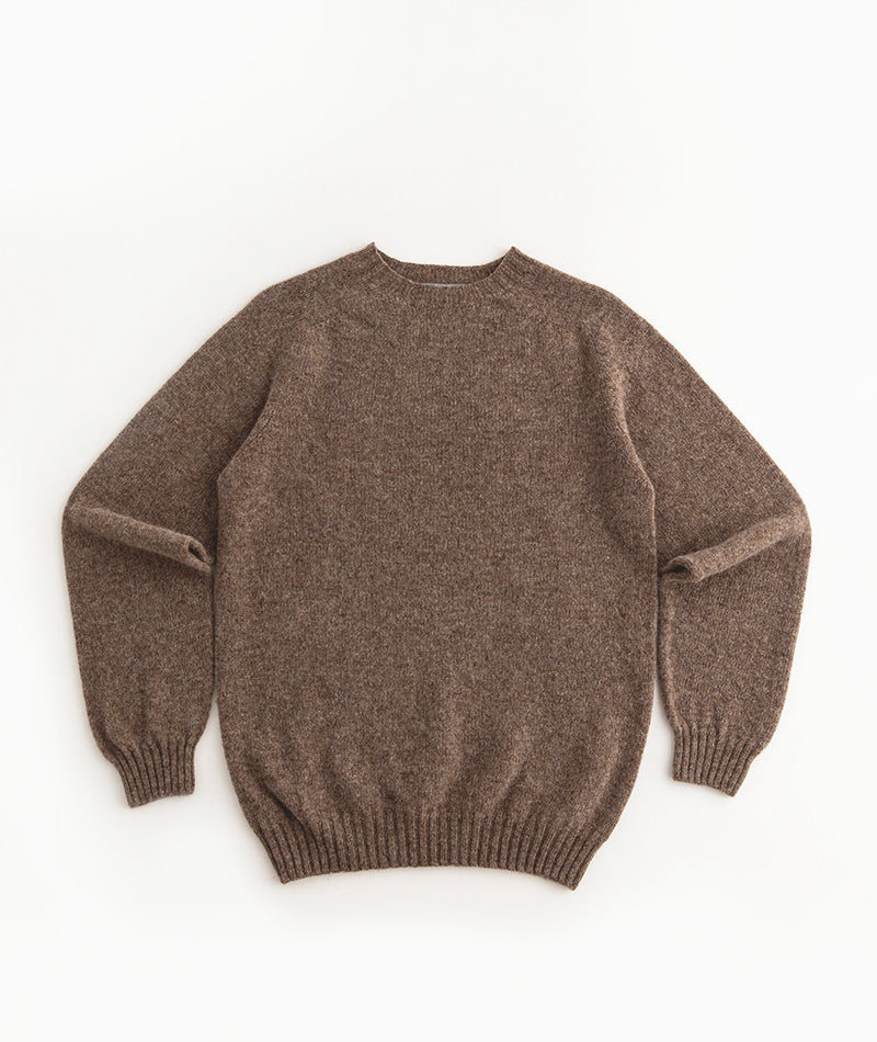 A true classic. This Men’s crew neck jumper is knitted in Scottish Supersoft Shetland pure new wool. It has saddle shoulder shaping for a more comfortable wear and the body of the jumper is seamless. The hem, neck and cuffs are finished with a rib knit. Available in a range of colours. Nutmeg is a light brown colour.