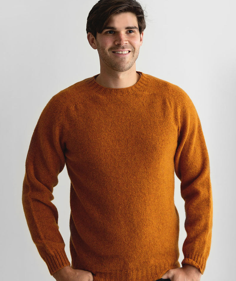 A true classic. This Men’s crew neck jumper is knitted in Scottish Supersoft Shetland pure new wool. It has saddle shoulder shaping for a more comfortable wear and the body of the jumper is seamless. The hem, neck and cuffs are finished with a rib knit. Available in a range of colours. Vintage orange is a gorgeous, dark orange.