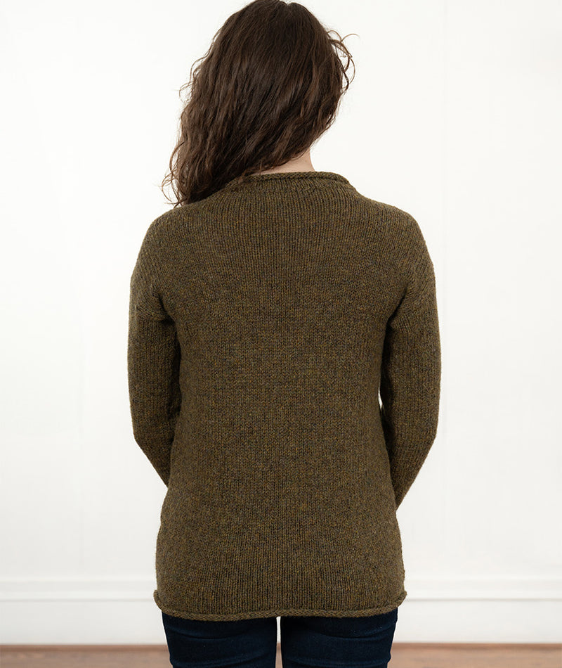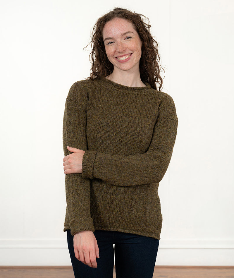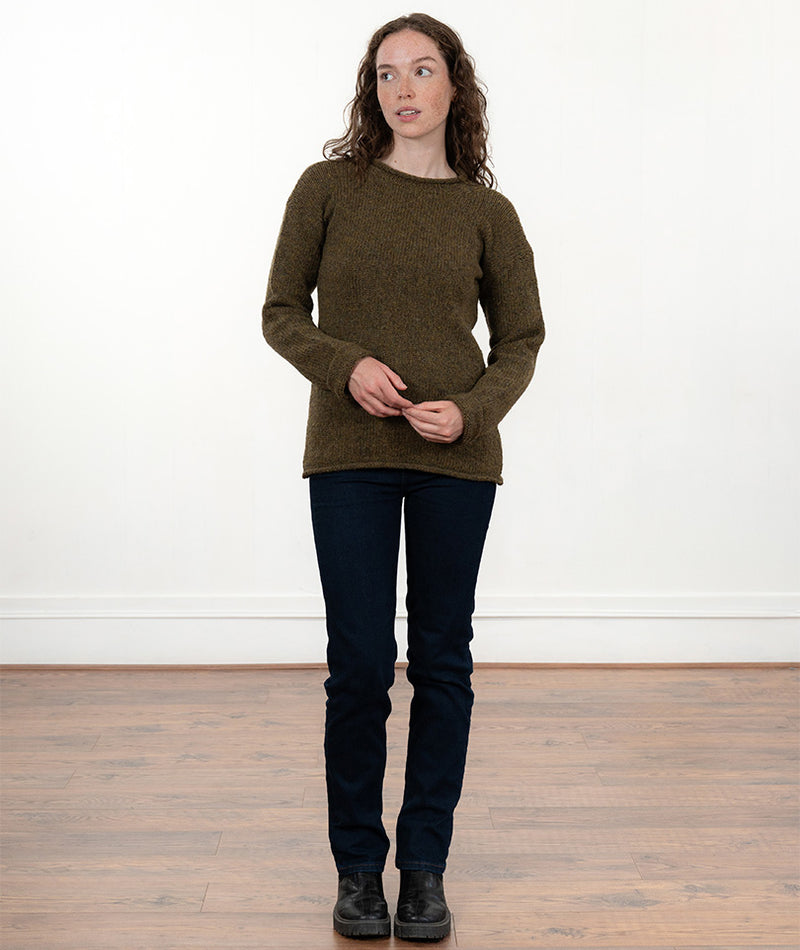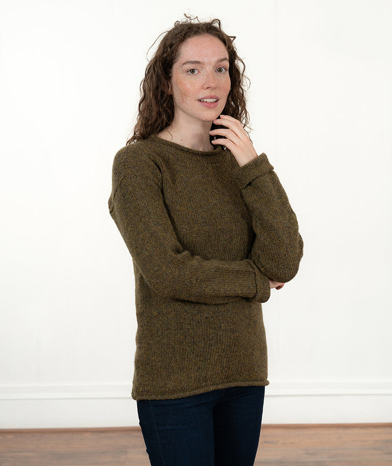 This relaxed-fit womens jumper has drop shoulder sleeves and is just so easy to wear. The neck and hem have a rolled finish and deep turn-back cuffs add extra detail. Knitted using wool in a blend of colours to give a flecked yarn taking each garment above the ordinary. Moss colourway is a blend of olive green, yellow and brown shades.